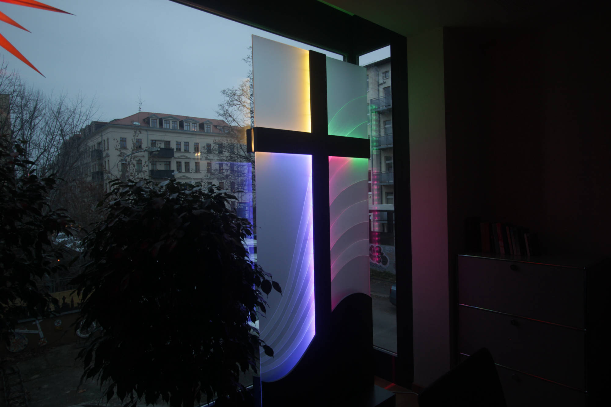Für die Baptistengemeinde in Leipzig wurde dieses Kreuz entworfen. Das Design und die Ausführung wurde durch Stuckateuermeister und Gestalter im Handwerk, Roland Städter realisiert. Wir durften unser know how bezüglich intelligenter Beleuchtung beisteuern.